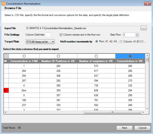MANTIS can normalize sample concentrations, by calculating and dispensing the necessary diluent volume for each well to ensure that every well has the same concentration. If you have concentration data saved in a .CSV file, such as the output data from CONSTELLATION® Digital PCR System, you can easily upload the .CSV into MANTIS to create a dispense list. Then you can use MANTIS to dispense the desired diluent into your experiment plate. Follow the instructions below to normalize your concentration data.
