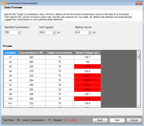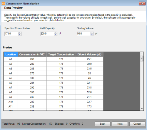 Specified Concentration: By default, the Specified Concentration value is taken from the well with the lowest concentration. You can also set a different target concentration value by typing the desired value in the box. Any wells with concentration lower than the Specified Concentration will be excluded from the normalization process.