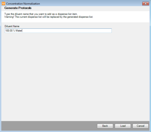 Type the Diluent name in the Diluent Name box and click the Load button to load the data into a Dispense List.