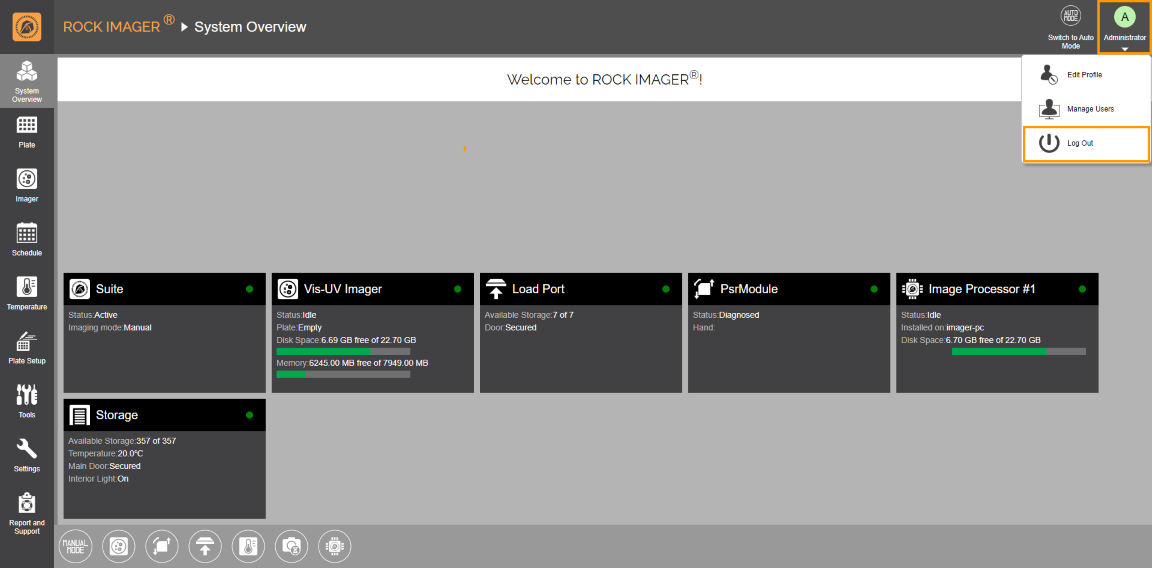 ROCK IMAGER® offers two kinds of accounts, regular user and administrator. By logging in as an administrator, you can create new accounts or delete and modify existing ones using the User Management tab.