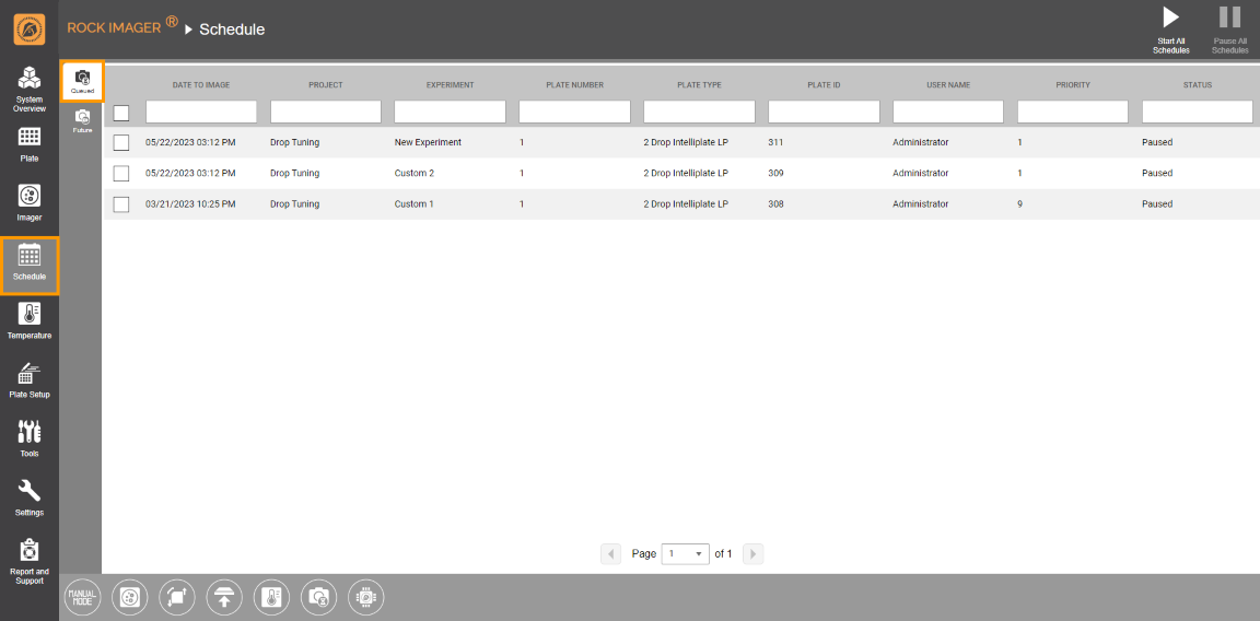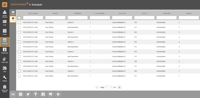This tab lists all plates that are currently waiting to be imaged. Each imaging schedule is moved from the Future Schedule tab to this queue on the day of its scheduled imaging.