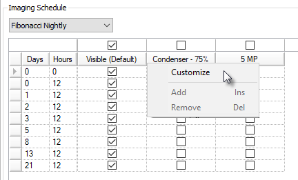 You may now edit the values in the Days and Hours columns. You can also change values in the columns representing each Imaging Setting to specify which image settings to use on each particular day. You may also add and delete days by right-clicking and selecting the appropriate command.