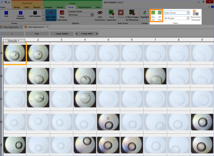 - In the Filters group, you can use the Any Hit button to only display drop images that contain at least one hit in one of the scoring modes, or use the All Hits button to only display images that contain hits in all scoring modes. You can filter the hit images based on a specific Scoring Mode, including All Scores, Auto Scores, or Manual Scores. You can also select single or all Scoring Group you desired to filter in each scoring mode. See Filtering Hits Based on Scores for more information.
