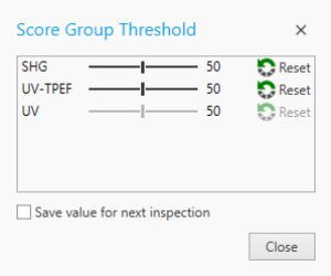 allows you to adjust the thresholds of a positive hit for each image. You can make the hit range smaller or larger, allowing more or fewer drops to be classified as hits. You can also select the Save value for next inspection checkbox if you want to save the adjusted threshold for use with future inspections.