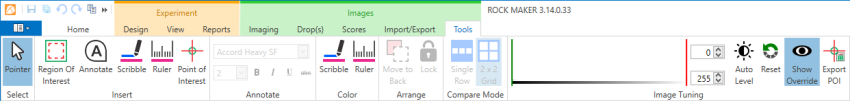 You can manage and organize your images in ROCK MAKER using the Images contextual tab set. The Images contextual tab set is displayed once you open an experiment that has images, and it includes five tabs: the Imaging, Drop(s), Scores, Import/Export, and Tools tabs.