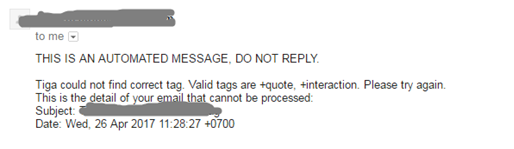Auto TIGA only accepts a +quote and +interation tags. Auto TIGA will automatically email you if there is an invalid tag used, so that you can quickly identify and fix the issue.