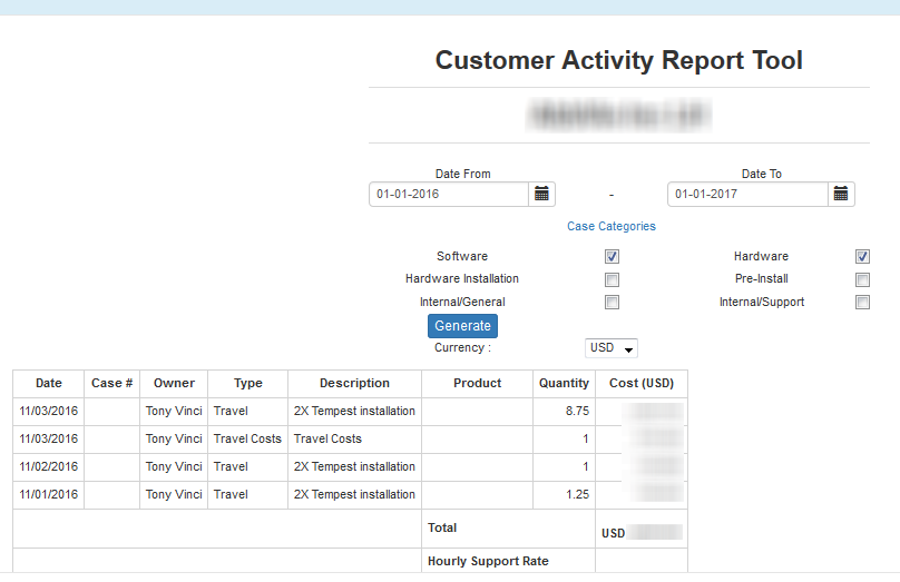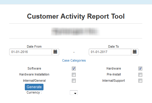 The Customer Activity Report on the Accounts table now includes options for Case Categories (i.e. Software, Hardware Installation, Internal/General, Hardware, Pre-install, and Internal/Support) and Currency, allowing you to choose a specific case and currency for the selected customer. For more information, see Generating Customer Activity Reports.