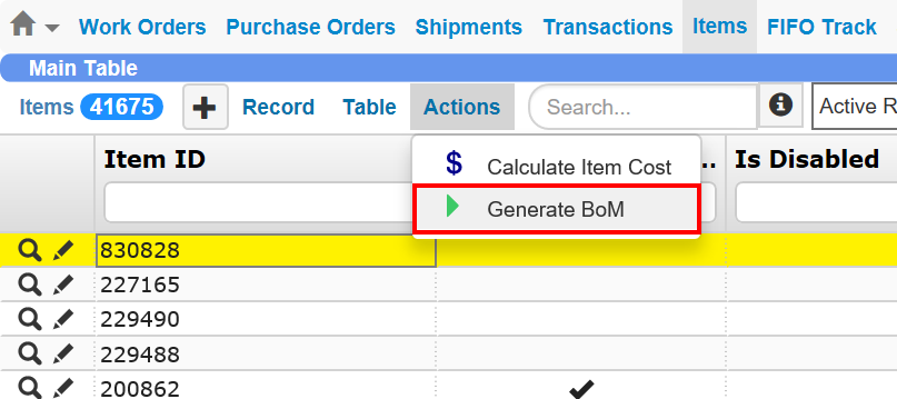 TIGA Bonded Zone now features the Generate BoM option in the Actions menu, making it easier to generate the desired Bill of Materials (BoM). To generate a BoM, select the desired records in the Items table, click the Actions menu, and then select Generate BoM.