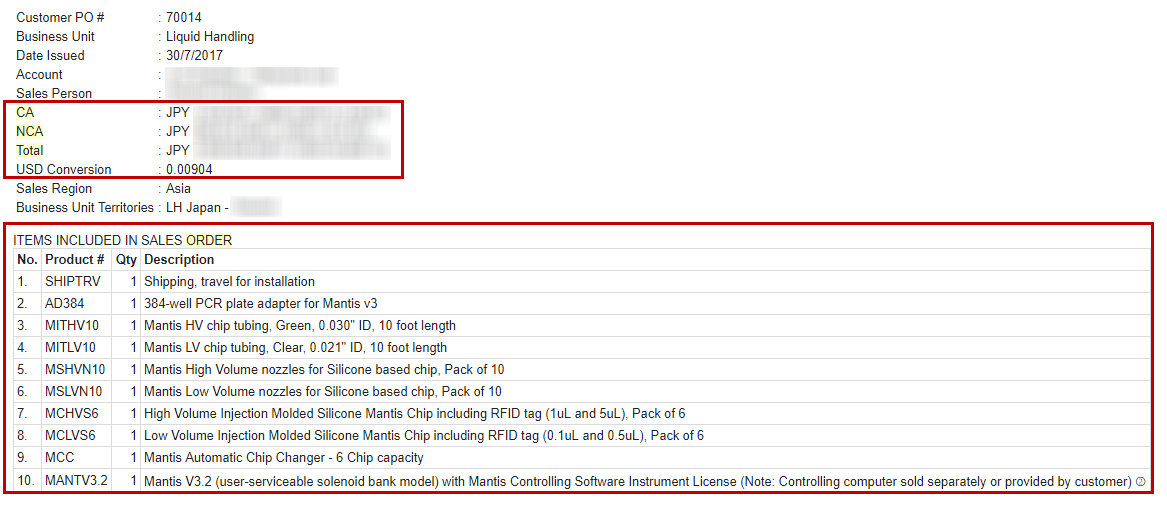 You can now view all of the included purchased items and currency conversion (in USD) information in the sales order email report once you have finished creating or updating sales order records.