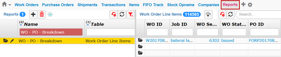 TIGA now supports the WO - PO - Breakdown filter in the Reports table, allowing you to quickly find and identify Work Order Line Items (WOLI) that share related WO IDs and PO IDs. This new filter searches through all of the available records so that you can easily see what WOs and POs are connected to your WOLI. To filter the data, go to the Reports table, type WO - PO - Breakdown in the Name column, and press Enter on your keyboard.