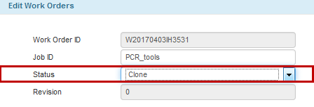 You can now quickly clone any existing work order and its line items to speed up the work order creation process. To clone a work order, select the desired work order on the Work Orders table, click the Pencil button, select Clone from the Status list, and then click Update at the lower-right corner of the Edit Work Orders window. See also Creating Work Orders (WO).