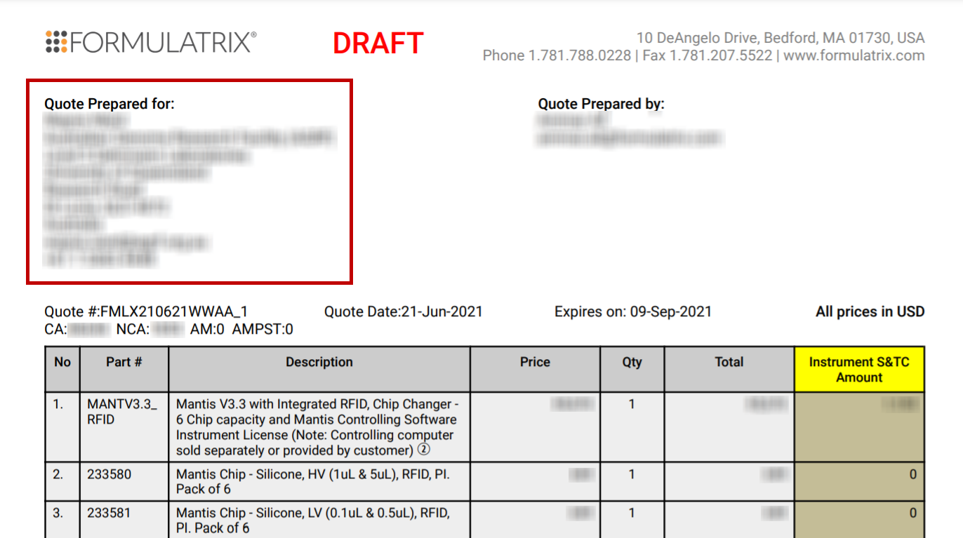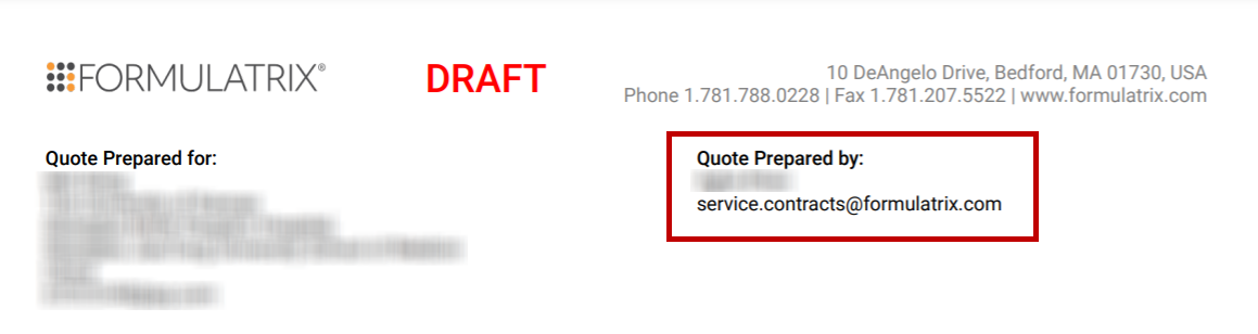 For more accurate data, the Quote Prepared by information now uses the quote sales person name and service.contracts@formulatrix email. We’ve also removed contact Phone # from all Maintenance quote PDF files.