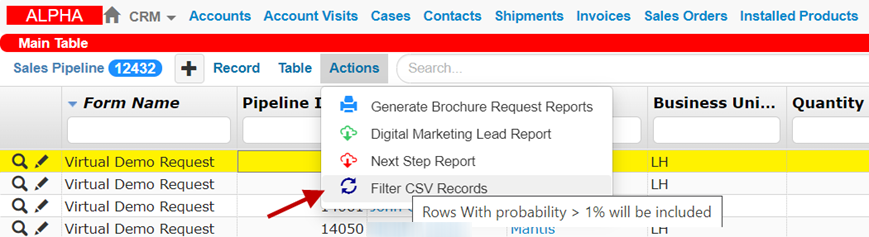 We’ve added the Filter CSV Records command in the Actions menu of the Sales Pipeline table that allows you to receive filtered sales pipelines with probability >= 1%.