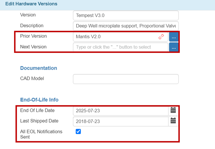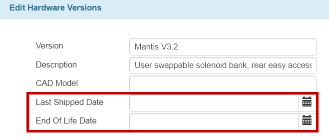 The Last Shipped Date and End of Life fields are now available in the Hardware Versions window, allowing you to add the last product shipment and its specific end of life date.