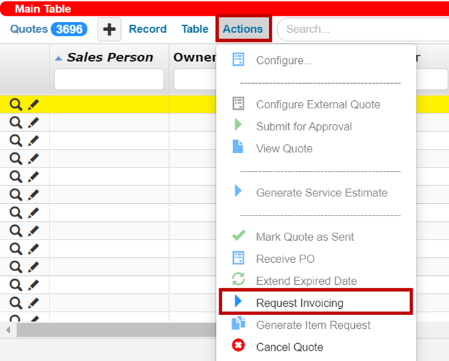 For better usability, you can request invoices for Draft Service Estimate (SIM) Quotes via the Request Invoicing command in the Actions menu on the Quotes main table bar.