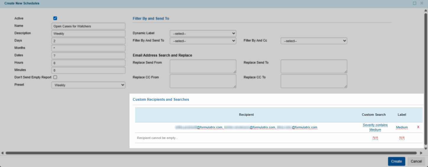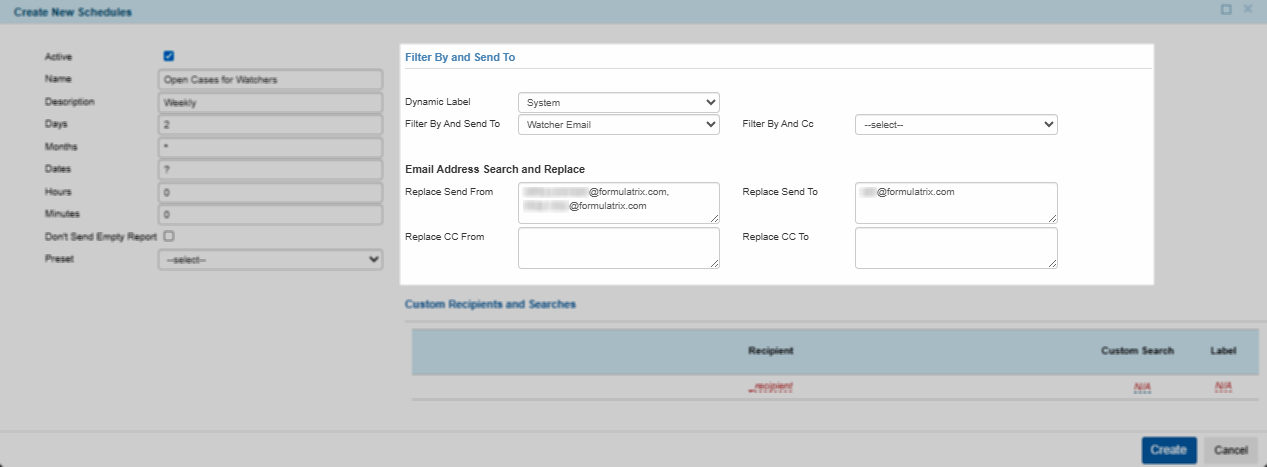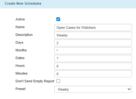 The following image illustrates that the “Open Cases for Watchers” report will be sent every Monday (2) of each month (*) at 12 AM FUSA time.