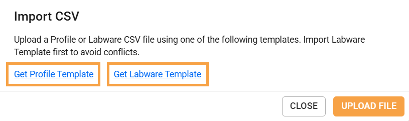 In the Import CSV dialog, select Get Profile Template or Get Labware Template.