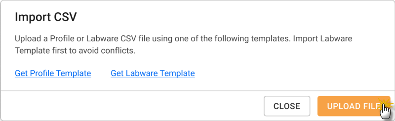 Click UPLOAD FILE and select the CSV file from your computer. If you want to upload the Labware and Profile files at the same time, upload them accordingly.