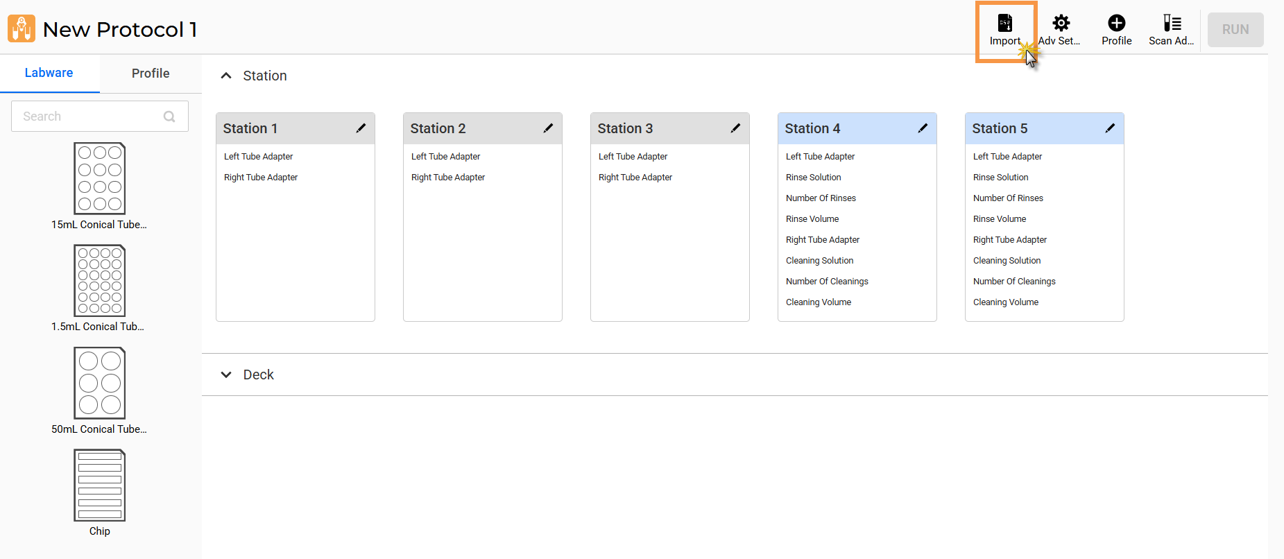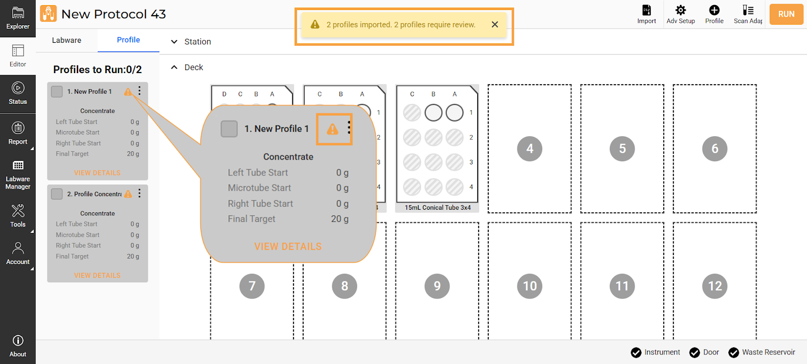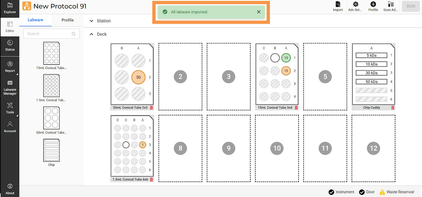 Once the upload is successful, the labware/deck and profile configuration will be automatically created on the Editor page. Be sure to review the imported labware and profile data settings before running the protocol.