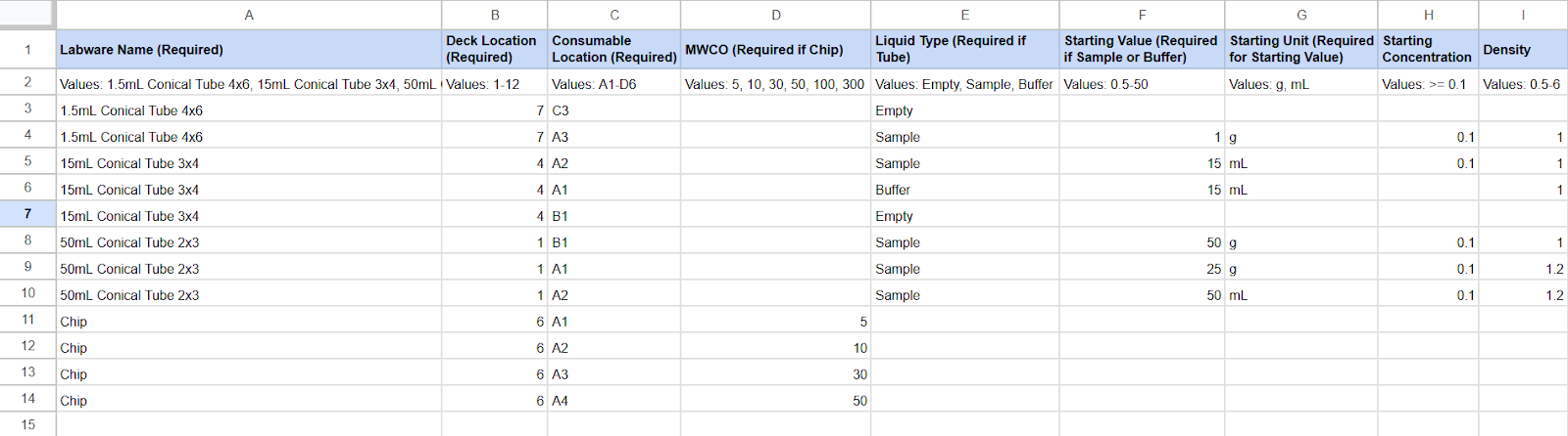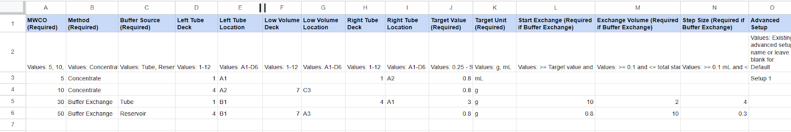 Follow the format in the second row and verify the values to prevent invalid entries. For example, the MWCO column must be a whole number without "kDa".