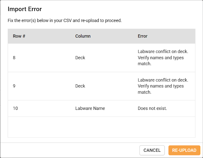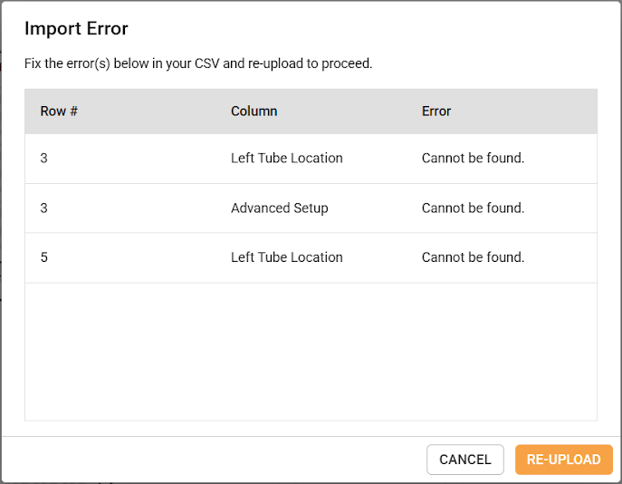 Important: When uploaded, invalid values or conflicting data will prompt an error message listing all errors with the imported file. Correct the displayed errors in your CSV file before re-uploading.