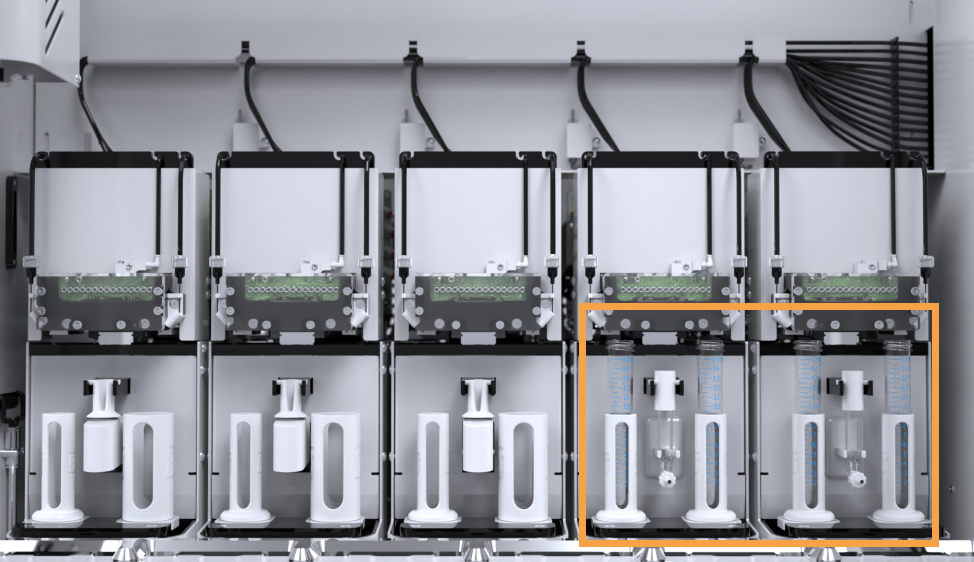 Place 15 mL tube adapters on the left and right scale of all Cleaning Stations. Insert empty 15 mL tubes in both adapters.