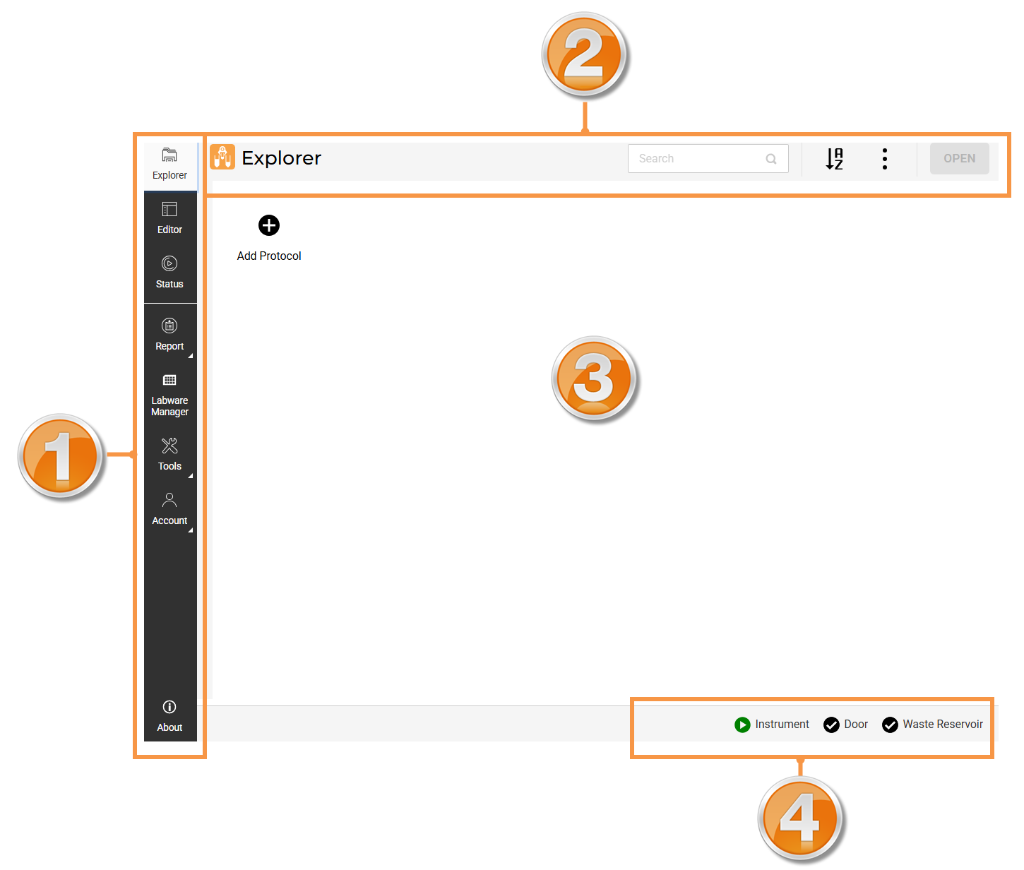 After login, aµtoPULSE opens the Explorer page as the landing page, which includes the Navigation Bar (1), Command Bar (2), Protocol List Panel (3), and Status Bar (4).