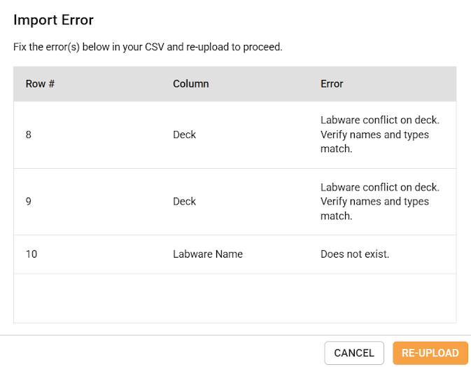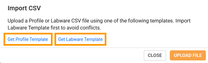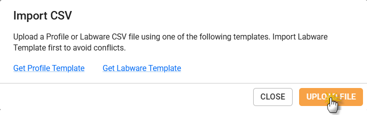Click UPLOAD FILE and select the CSV file from your computer. If you want to upload the Labware and Profile files at the same time, upload them accordingly.