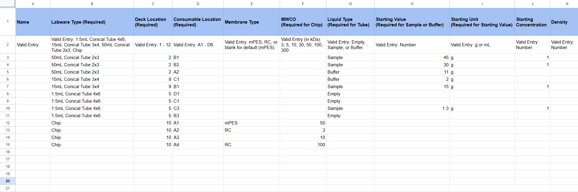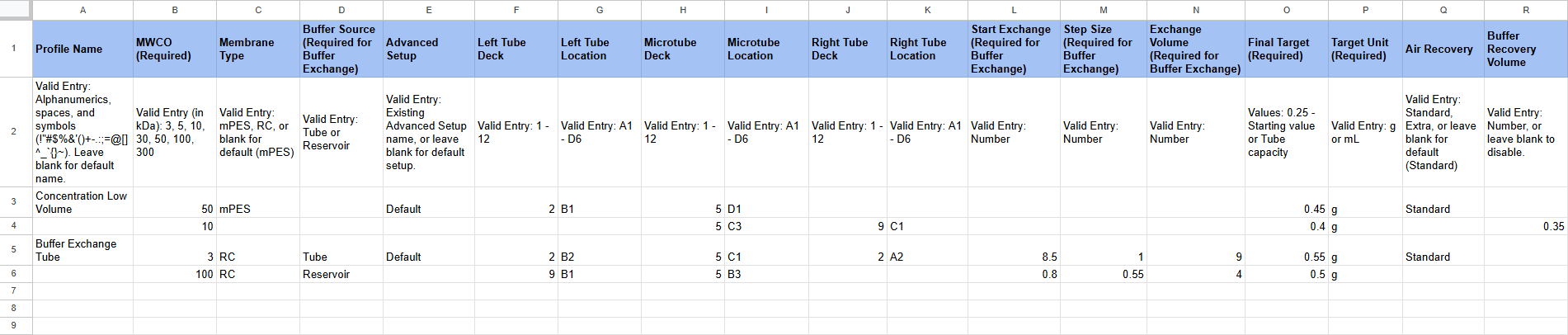 Follow the format in the second row and verify the values to prevent invalid entries. For example, the MWCO column must be a whole number without “kDa”.