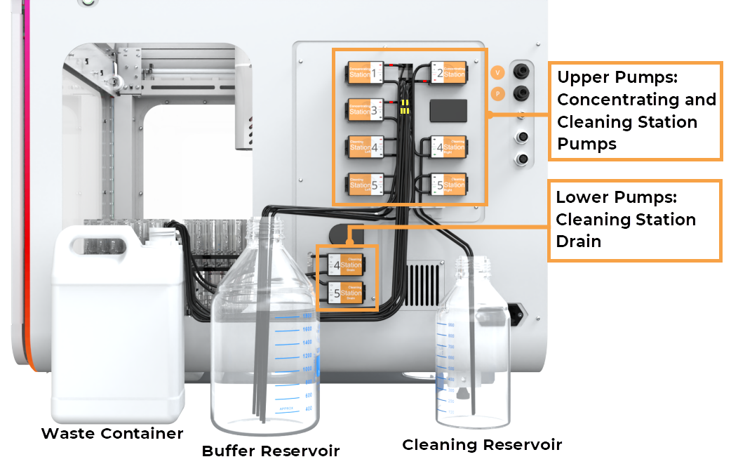 For smooth liquid transfer and recirculation into and out of the station, place the cleaning/buffer reservoirs within 0.5 meters of the Peristaltic Pump area, either beside or below the instrument. Do not position the waste container higher than the instrument.