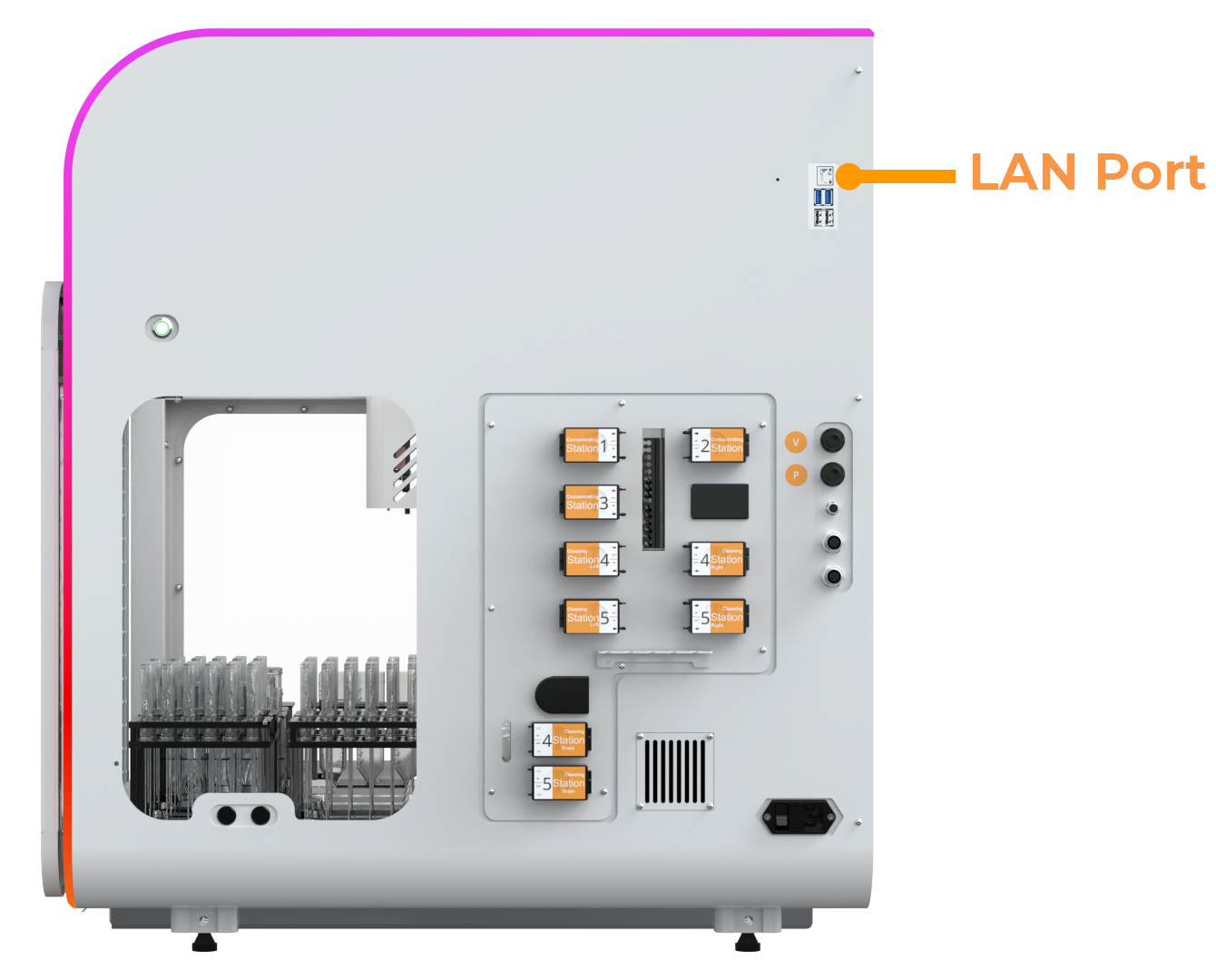 On the upper right side of the instrument, plug one end of the LAN cable into the LAN Port.