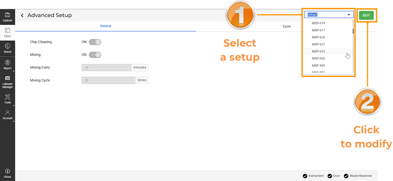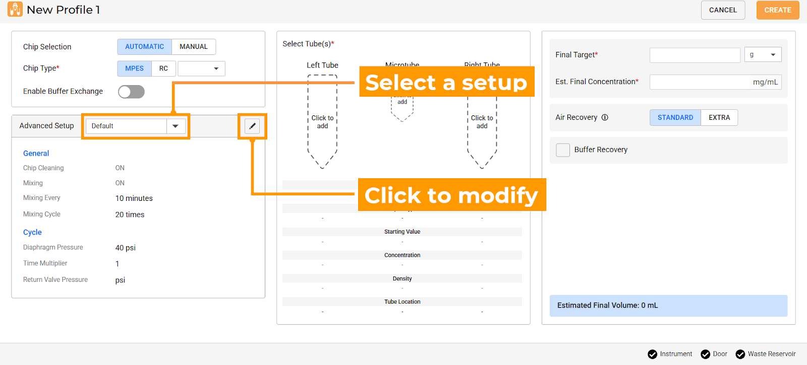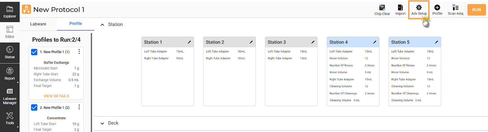 The Advanced Setup feature allows you to define chip settings in a profile, including cleaning, mixing, and pressure control. You can customize these settings or create different setups for specific profiles. The Advanced Setup is accessible from the Editor page or during profile creation.