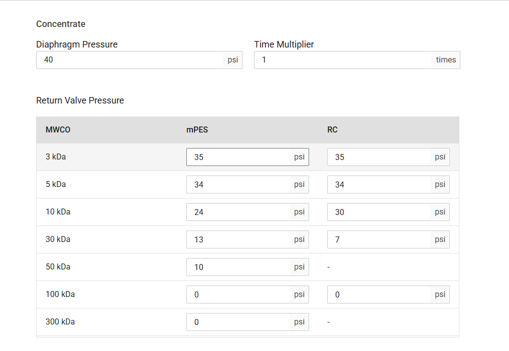 Return Valve Pressure: Set the return valve pressure (in psi) to control the membrane outlet pressure (retentate pressure). Specify the value for each kDa.