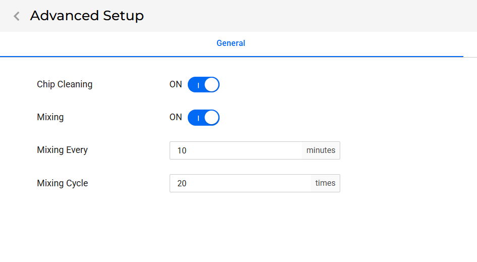 Open the General tab, define the chip’s cleaning and mixing settings.