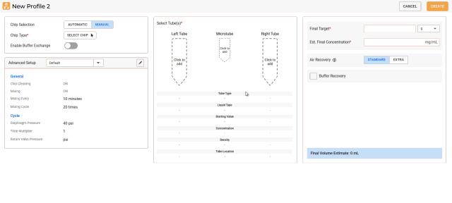 aµtoPULSE now offers AUTOMATIC and MANUAL chip selection modes, letting you control how chips are paired with your samples. In MANUAL mode, you can assign a specific chip on the deck to each sample. In AUTOMATIC mode, the instrument will assign any chip based on the chosen membrane chemistry and MWCO. Chip selection mode can be controlled independently per sample.