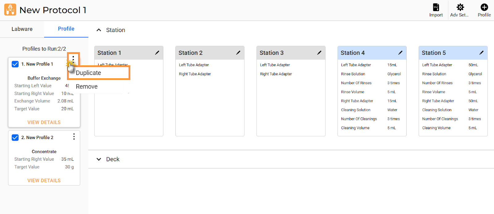 You can duplicate profiles on the Protocol Editor page to save time, reduce manual setup errors, and simplify customization for different profiles. Access the Duplicate option from the selected active profile.