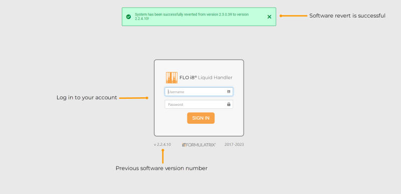 After restarting the software, you will be automatically logged out of your account. In the Sign In page, a message will appear to notify you that the software revert is successful.