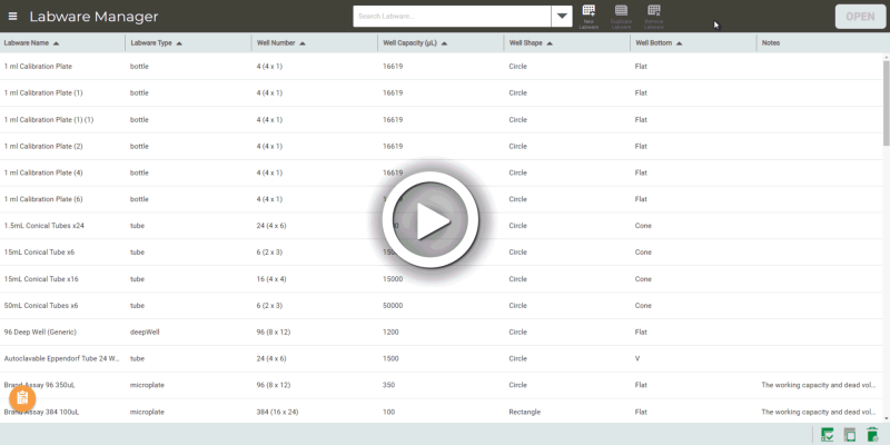 FLO i8 lets you modify and adjust the existing labware types according to your experiment preferences. Accessible on the menu bar, the options include Sort, Search, Duplicate, Remove, and Open Labware Setup.
