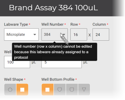 Note: Well Number, Row, and Column cannot be modified especially when the labware is already assigned to a protocol. Subsequently, the Row and Column cannot be edited, even if the labware is not assigned to any protocol. But, you can edit the fields if you select Custom well number.