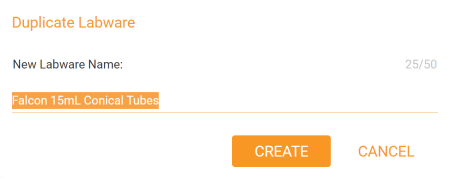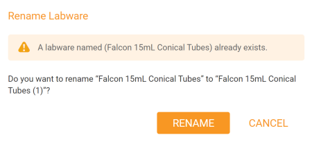 If you proceed to click the CREATE button without renaming the labware, a warning message will appear.