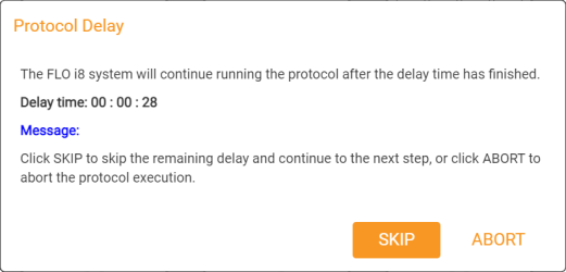When the protocol reaches a Delay step, the system then pauses for a specified amount of time before automatically continuing. The Delay dialog shows the remaining delay time and message you’ve set (if any). This can be helpful, for example, when allowing a chemical reaction to occur before continuing the protocol execution. See Adding a Delay for more information.