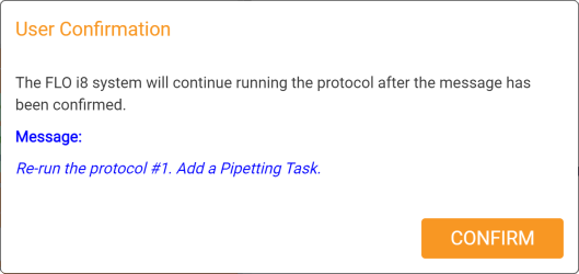 When the protocol reaches a User Confirmation step, the system pauses until the user gives confirmation to continue. This allows you to perform another task with the stock or labware during a protocol execution. For example, if you cantake out a plate from the FLO i8 deck and image it before further pipetting operations. The User Confirmation dialog box displays the reminder message you’ve set. Click CONFIRM to continue protocol. For more information, see Adding a User Confirmation.