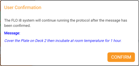 The FLO i8 system allows you to add a User Confirmation step between the pipetting steps in a protocol. The User Confirmation pauses the protocol execution until you give confirmation to proceed. These actions are useful in cases where you want to perform another task outside the FLO i8 system for the liquid and/or labware. For instance, if you want to adjust the labware or liquid temperature to a certain degree for a short period of time. The protocol will proceed once you have put the labware back into the FLO i8 deck and given confirmation.