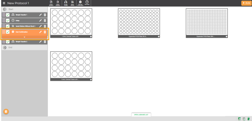 The user confirmation step will be added at the end of the protocol step list. To change the order of the user confirmation step, click on the grid button of the selected step and drag to the desired location. Click Apply to save the order changes.