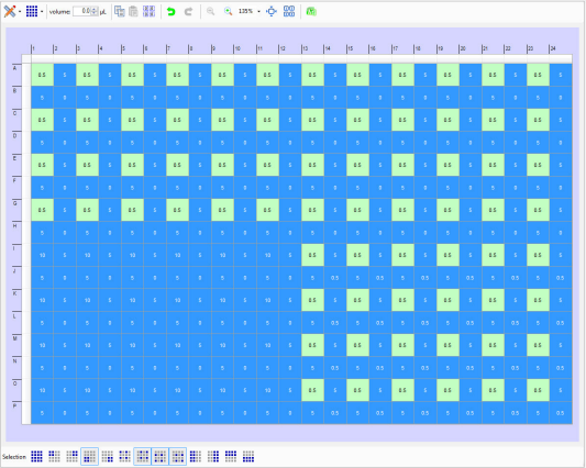 The MANTIS software provides you with several options to select multiple wells using different patterns, to speed up the dispense design process. This can be especially useful when using plates with large numbers of wells. There are 13 different patterns available in the MANTIS software. A blue box surrounding the icon indicates that a selection pattern is active, while inactive patterns do not have a blue box. You may use more than one pattern at a time, according to your needs. When you have applied a selection pattern, you can easily define the volume for the selected well(s) by either typing a volume or by using the available dispense designs.