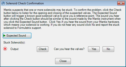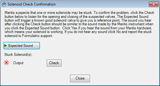 If MANTIS suspects one or more solenoids of being stuck, the Solenoid Check Confirmation window will appear. The Solenoid Check Confirmation process allows you to confirm whether or not a solenoid is truly stuck. Click Expected Sound to listen to what a solenoid valve should sound like when it opens and closes.