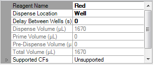 At the bottom of the dispense list is a box of information that changes based on which reagent is highlighted in the dispense list. This table shows you the reagent's name, the dispense location, the reagent's barcode (if any), the dispense volume, the prime volume, the pre-dispense volume, the total volume, and whether or now continuous flow chips are supported. You can change these items if they are shown in bold text. To see your options, click anywhere in the text field of the bold text, then click the down-arrow to display the options.