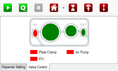 The Air Pump turns the air pump on and off. The air pump provides adequate pressure and vacuum for MANTIS to run the dispensing, priming and washing processes. Red indicates that the air pump is inactive, and green indicates that it is active. The air pump also will automatically activate when you run dispense, prime, and wash. When you run the dispensing process, it takes two seconds for the air pump to start. The air pump will need to stabilize the pressure and vacuum before MANTIS runs the dispensing process. When MANTIS has finished running the dispensing process, the air pump will be inactive after it reaches its timeout limit.