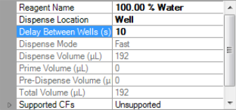 A dispense delay can be applied to your experiment when you want the MANTIS to pause at some point during dispense list execution. In MANTIS, there are two types of dispense delay: Delay Between Reagents and Delay Between Wells. You can add a delay between reagents if you want to pause the dispense for some time in after a certain reagent has been dispensed, or you can add a delay between wells when you want to allow the reaction between your reagents to develop for an exact amount of time.