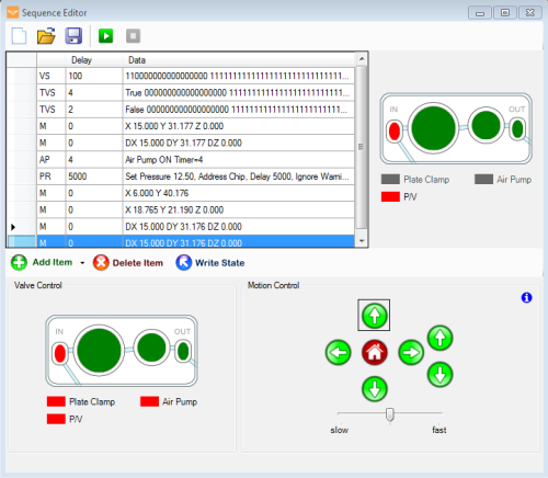 In the first column of the Sequence Editor, M indicates a move command, and VS indicates a valve state. The Delay shows the time spent on each valve state. Move commands are run at a constant speed without delays. The Data column is populated with the Cartesian coordinates of the move or the state of each valve.